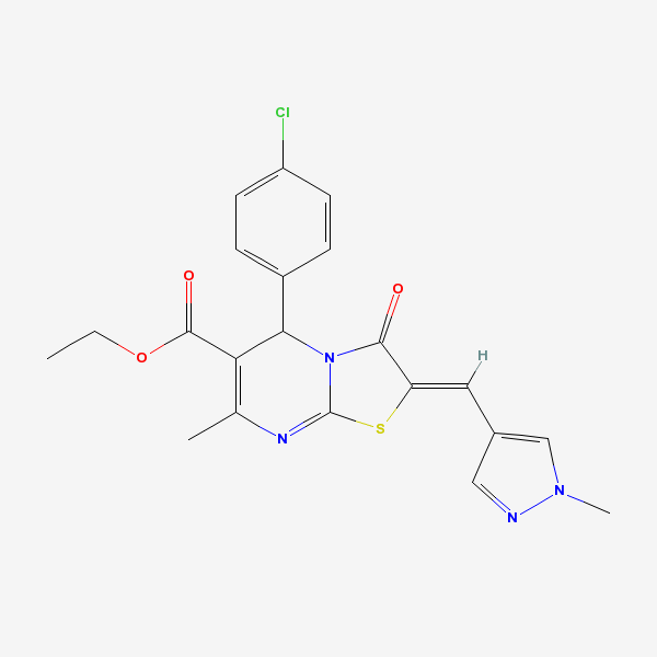 InChI: InChI=1/C21H19ClN4O3S/c1-4-29-20(28)17-12(2)24-21-26(18(17)14-5-7-15(22)8-6-14)19(27)16(30-21)9-13-10-23-25(3)11-13/h5-11,18H,4H2,1-3H3/b16-9-