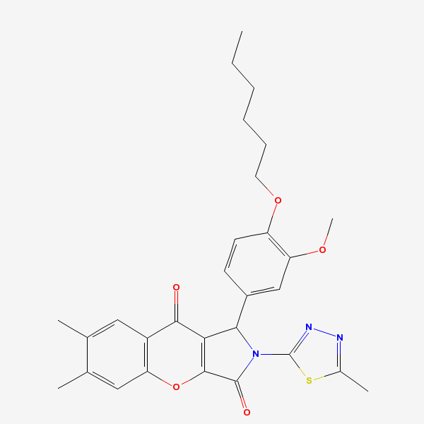 InChI: InChI=1/C29H31N3O5S/c1-6-7-8-9-12-36-21-11-10-19(15-23(21)35-5)25-24-26(33)20-13-16(2)17(3)14-22(20)37-27(24)28(34)32(25)29-31-30-18(4)38-29/h10-11,13-15,25H,6-9,12H2,1-5H3