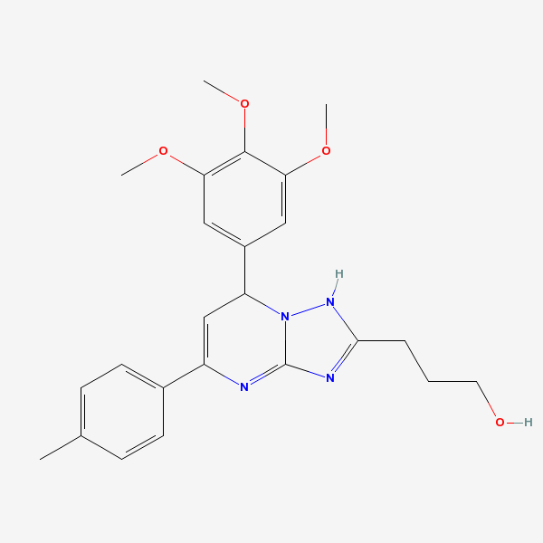 InChI: InChI=1/C24H28N4O4/c1-15-7-9-16(10-8-15)18-14-19(28-24(25-18)26-22(27-28)6-5-11-29)17-12-20(30-2)23(32-4)21(13-17)31-3/h7-10,12-14,19,29H,5-6,11H2,1-4H3,(H,25,26,27)/f/h27H