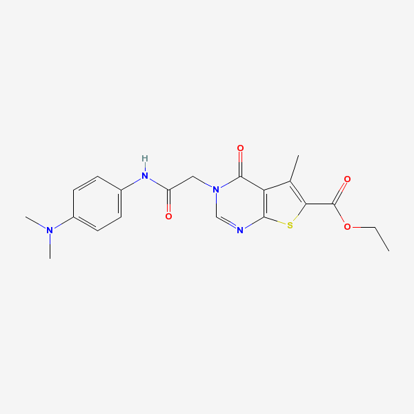 SMILES: CCOC(=O)C1=C(C2=C(S1)N=CN(C2=O)CC(=O)NC3=CC=C(C=C3)N(C)C)C