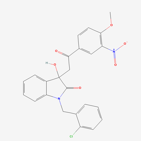 SMILES: COC1=C(C=C(C=C1)C(=O)CC2(C3=CC=CC=C3N(C2=O)CC4=CC=CC=C4Cl)O)[N+](=O)[O-]