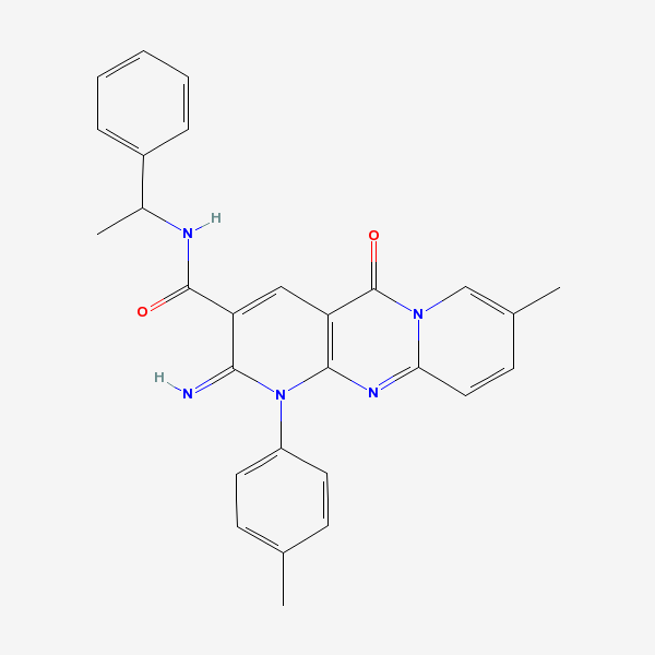 InChI: InChI=1/C28H25N5O2/c1-17-9-12-21(13-10-17)33-25(29)22(27(34)30-19(3)20-7-5-4-6-8-20)15-23-26(33)31-24-14-11-18(2)16-32(24)28(23)35/h4-16,19,29H,1-3H3,(H,30,34)/b29-25+/f/h30H